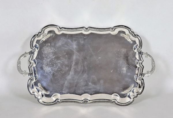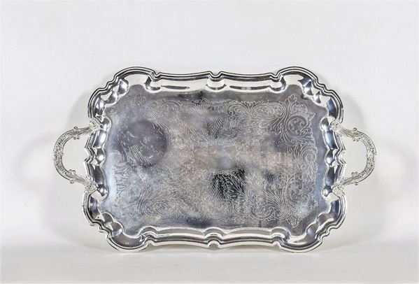 Rectangular tray in embossed and chiseled silver-plated metal with two handles