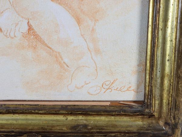 Signed. "Angel with fruit", drawing on canvas