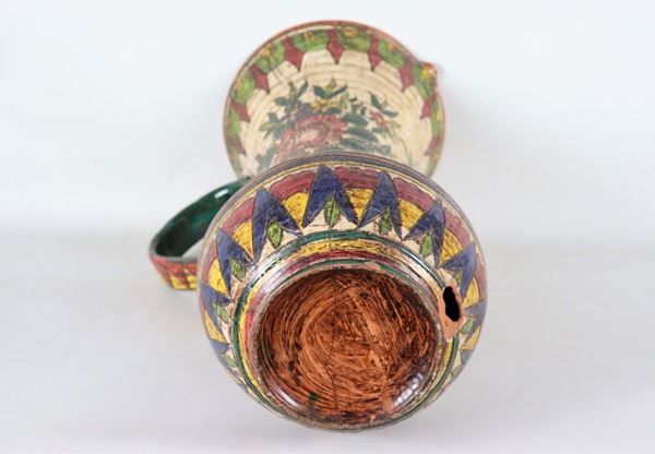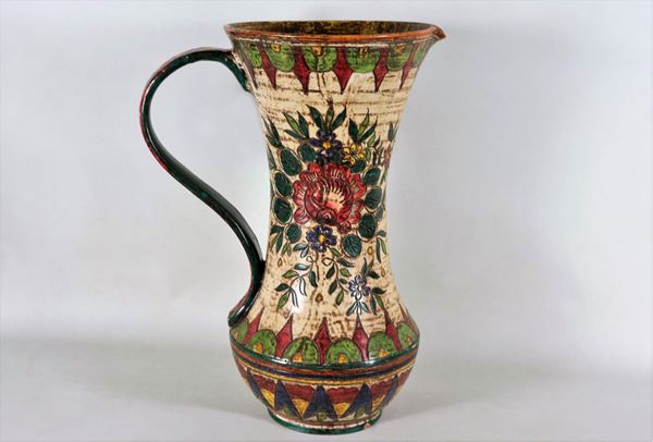 Umbrella stand in the shape of a large jug, in majolica and polychrome ceramic with floral motifs