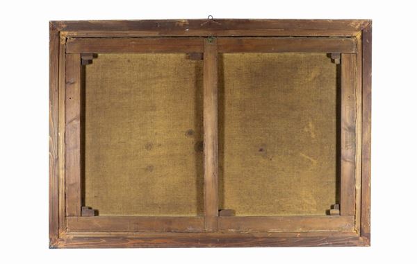 silver-plated wooden frame. The canvas has slight defects, 90 x 135 cm.