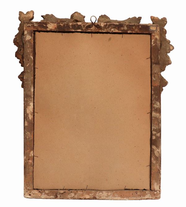 Ancient small Roman mirror in gilded wood and carved with floral scroll motifs, mercury mirror
