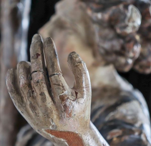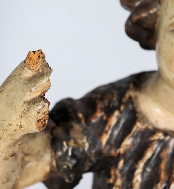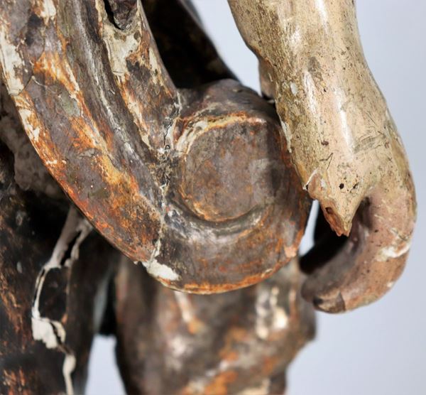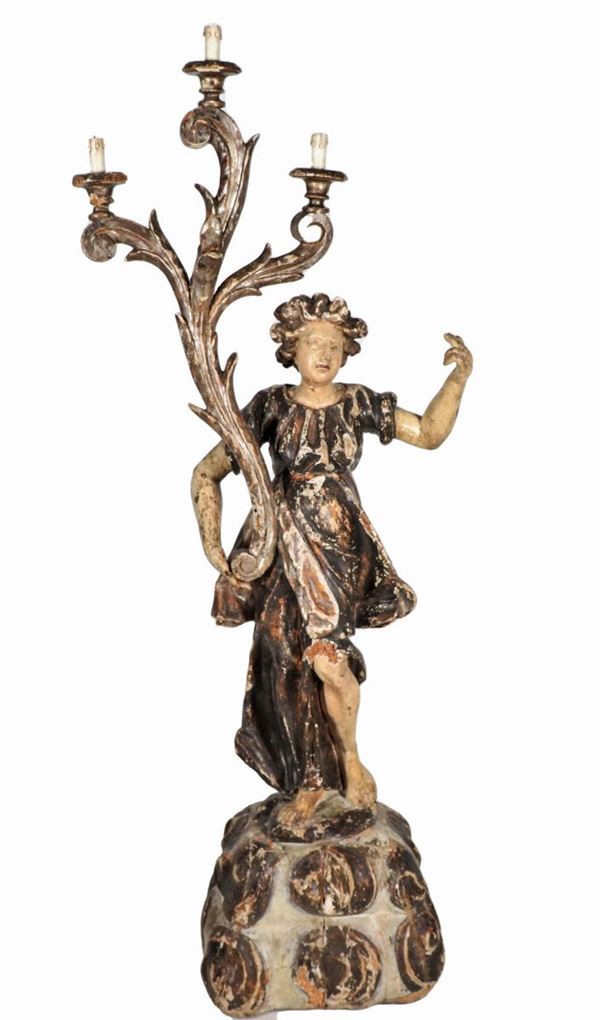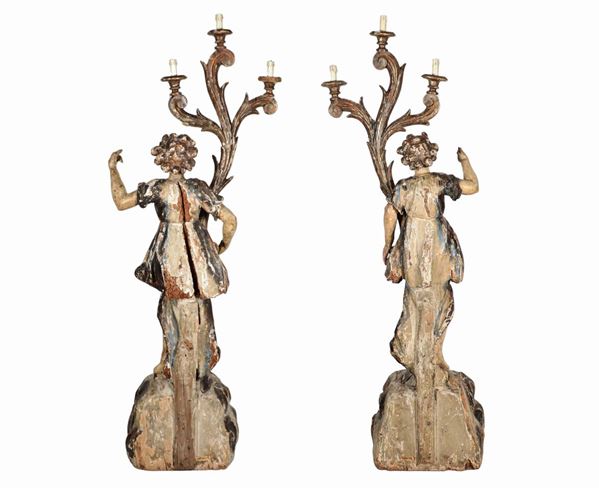 "Angels", pair of large sculptures in carved and polychrome wood, with electric light reduction, three lights each
