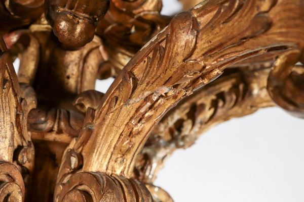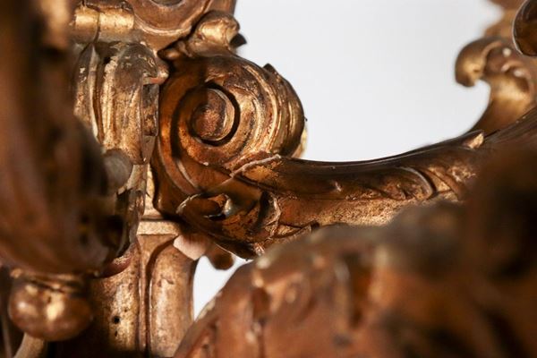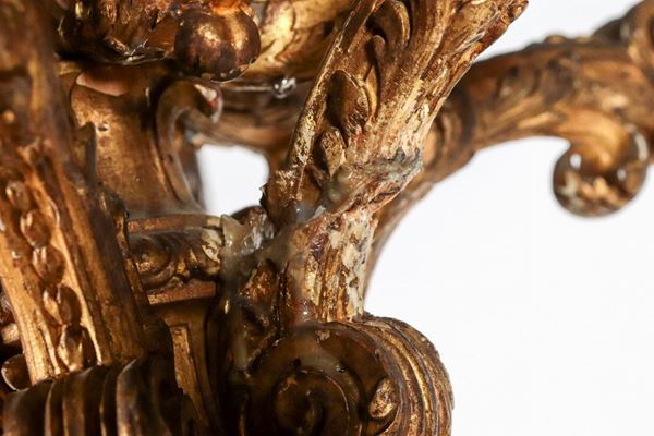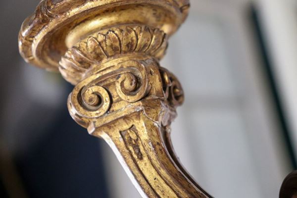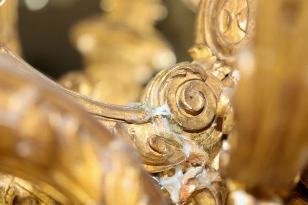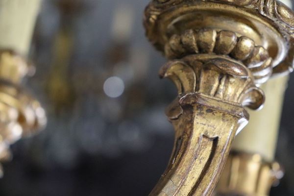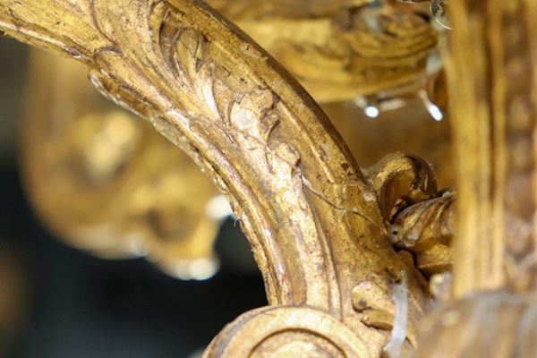 Antique French floor torch of the Louis XV line, in gilded and carved wood with fifteen arms