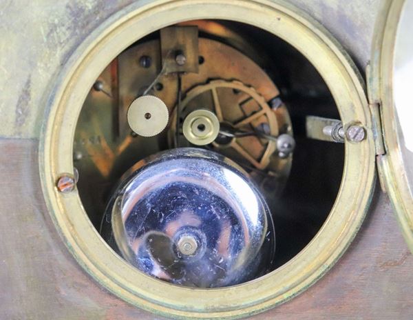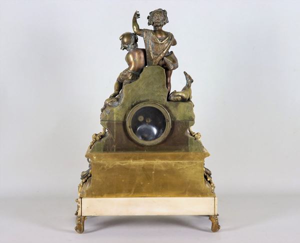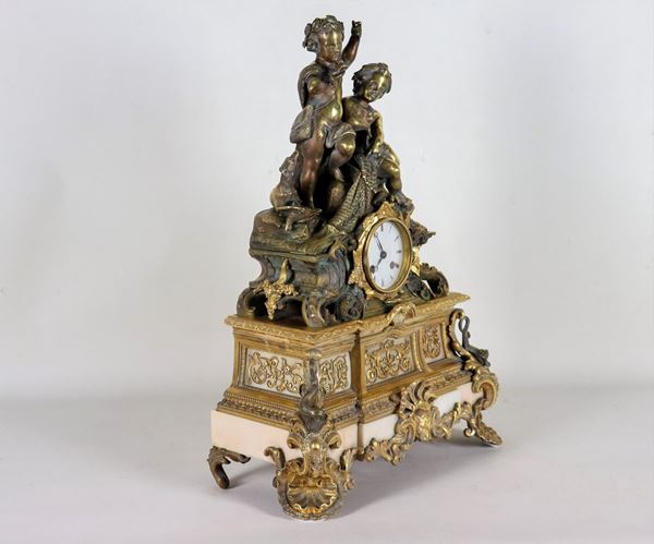 Antique French table clock in gilt bronze and white marble, with sculptures of Putti and dog, supported by shell feet. White enamel dial with [..]