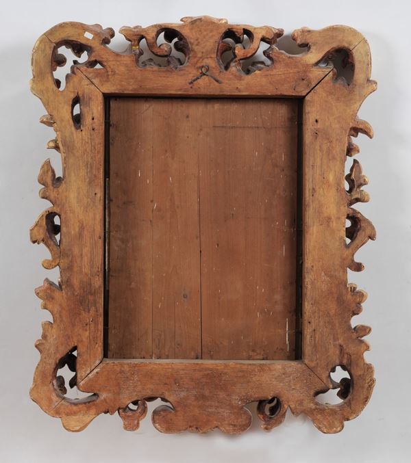 Antique mirror in gilded wood, richly carved with motifs of volutes of acanthus leaves, mercury mirror