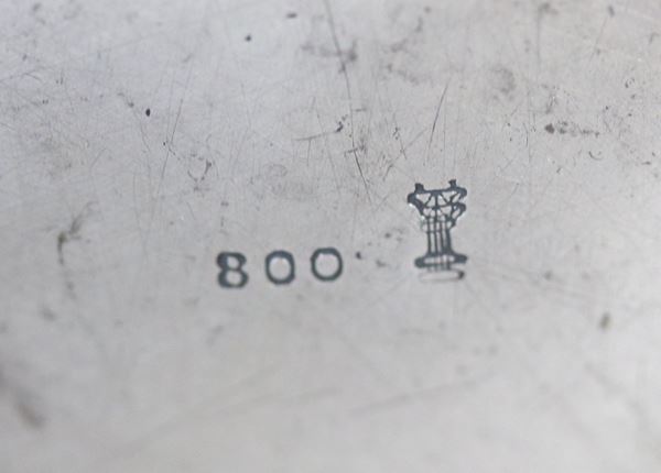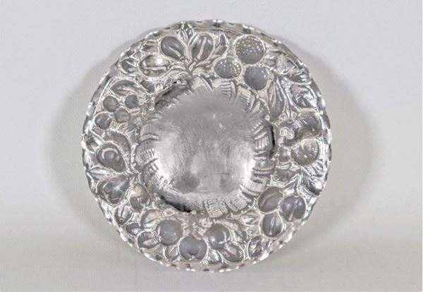 Antique round silver saucer, with chiseled and embossed edge with fruit motifs, supported by three curved feet, gr. 140