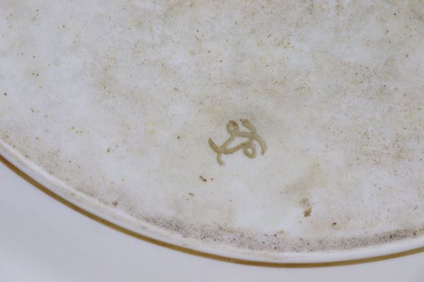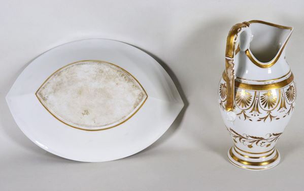 Basin and jug from the Empire period, in white porcelain with pure gold decorations with neoclassical palmette motifs