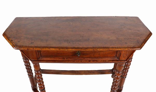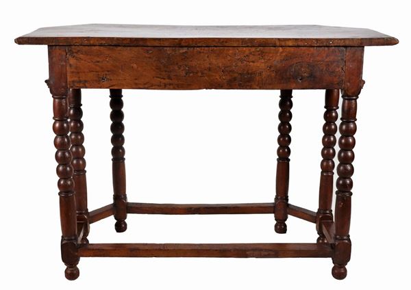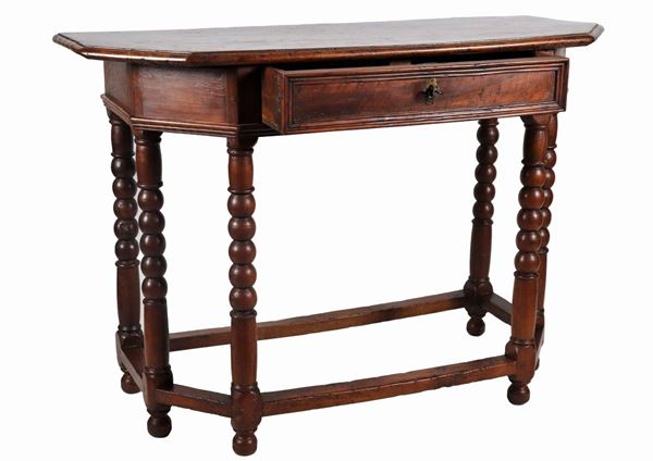 Bolognese console in walnut, rectangular shaped with six spool legs joined together as a cross