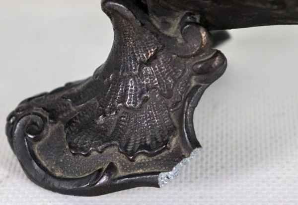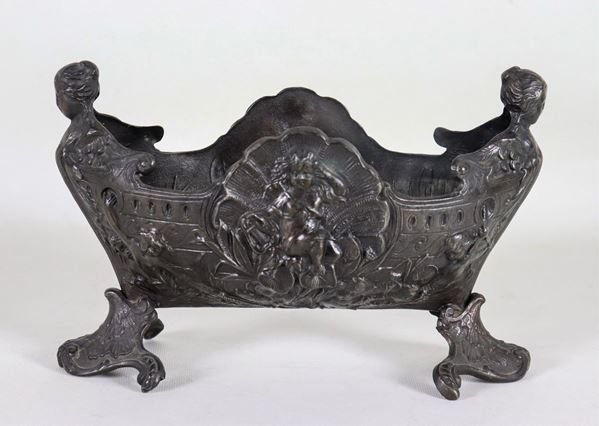 Centerpiece in burnished and patinated metal, with embossed decorations with cherubs, shells and caryatids motifs