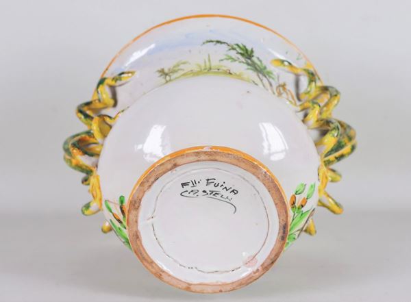 Centerpiece in glazed majolica, with colorful decorations with "Landscapes and marine" motifs, handles in the shape of snakes. Marcato F.lli [..]
