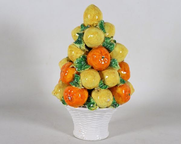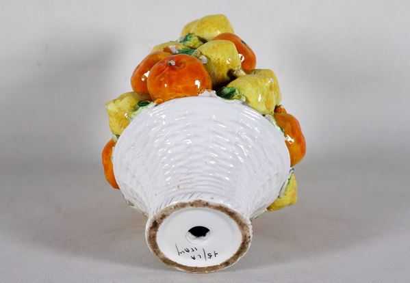 Centerpiece "Vase with mandarins and lemons" in polychrome majolica and enamelled ceramic, marked 15 / LA - Italy