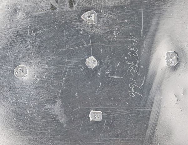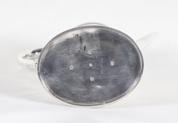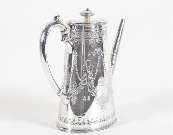 Coffee pot from the Queen Victoria era, embossed and chiseled silver with Louis XVI festoons, curved handle, gr. 690