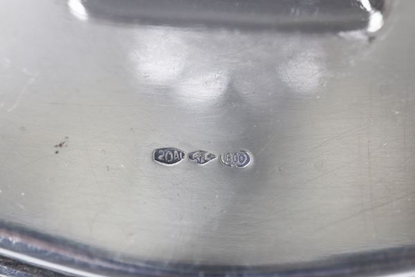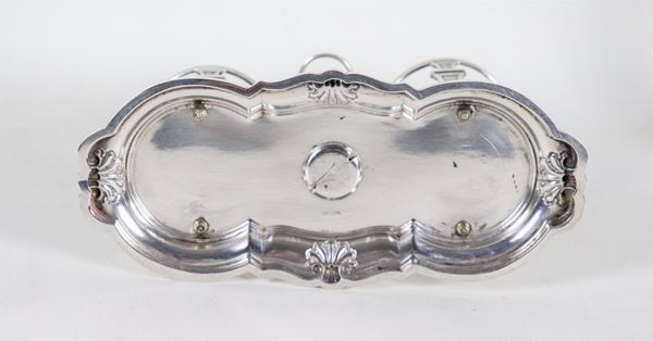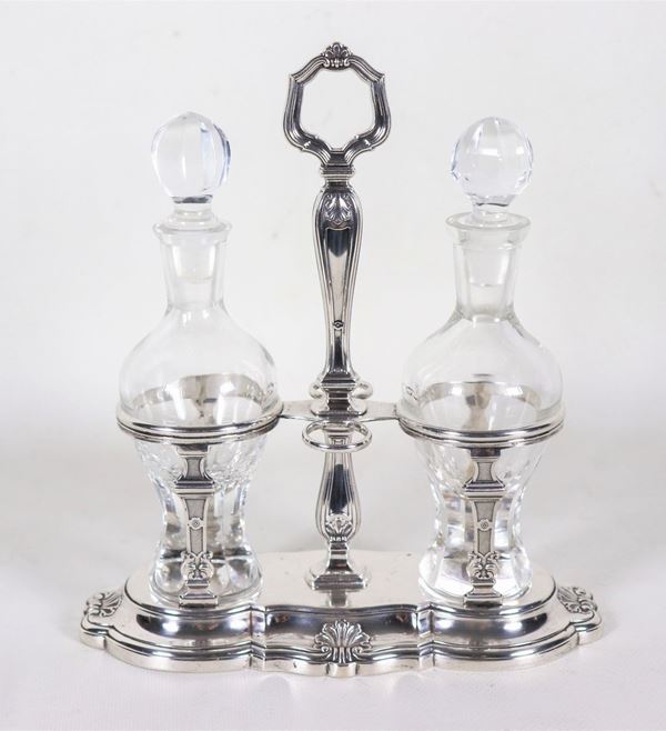 Cruet in chiseled and embossed silver with shell motifs, two crystal ampoules, gr. 330
