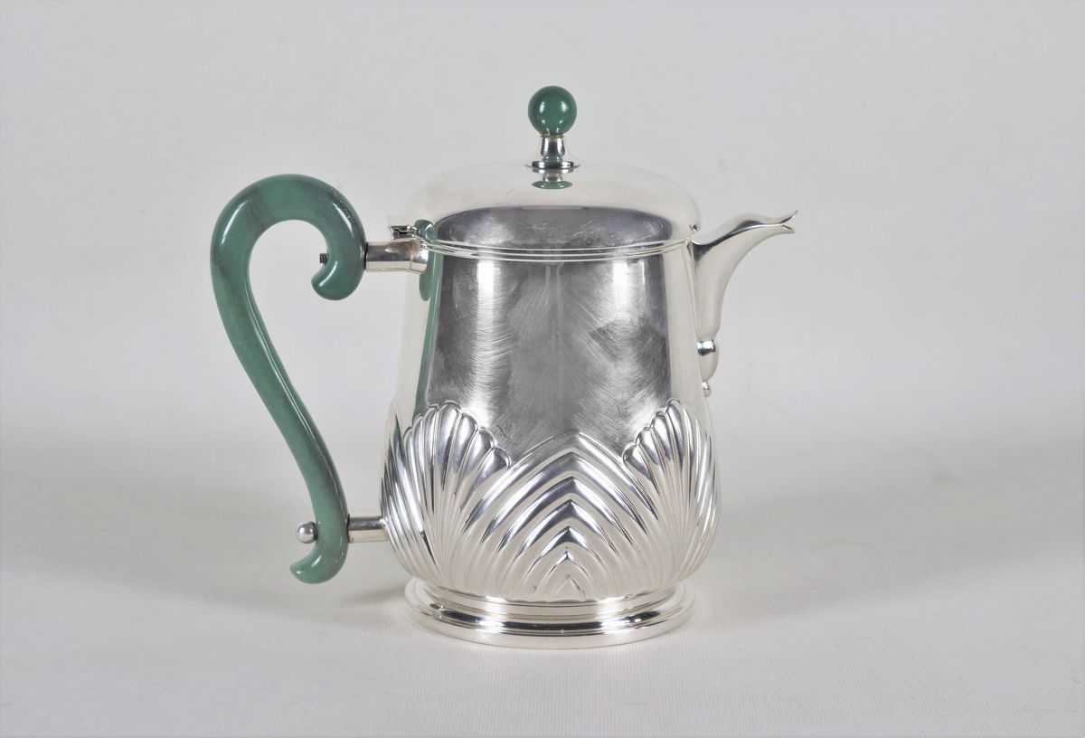 Decò silver coffee pot, chiseled and embossed with palmettes with handle and pommel in fake green jade, gr. 990