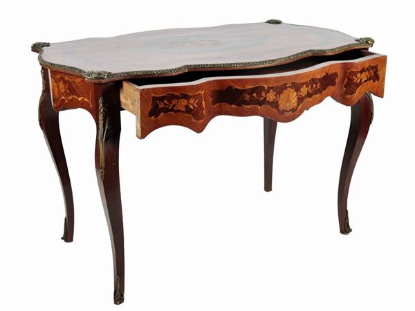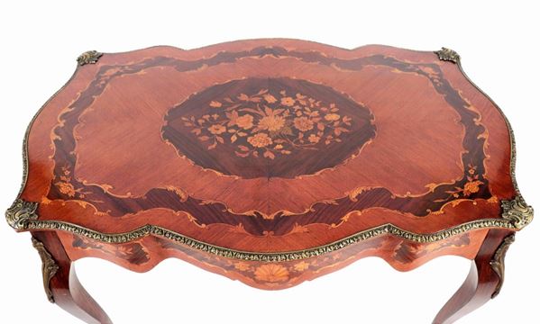 French Napoleon III center table, with a ribbed rectangular shape, in walnut, purple ebony and bois de rose, entirely inlaid with floral scroll [..]