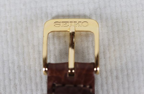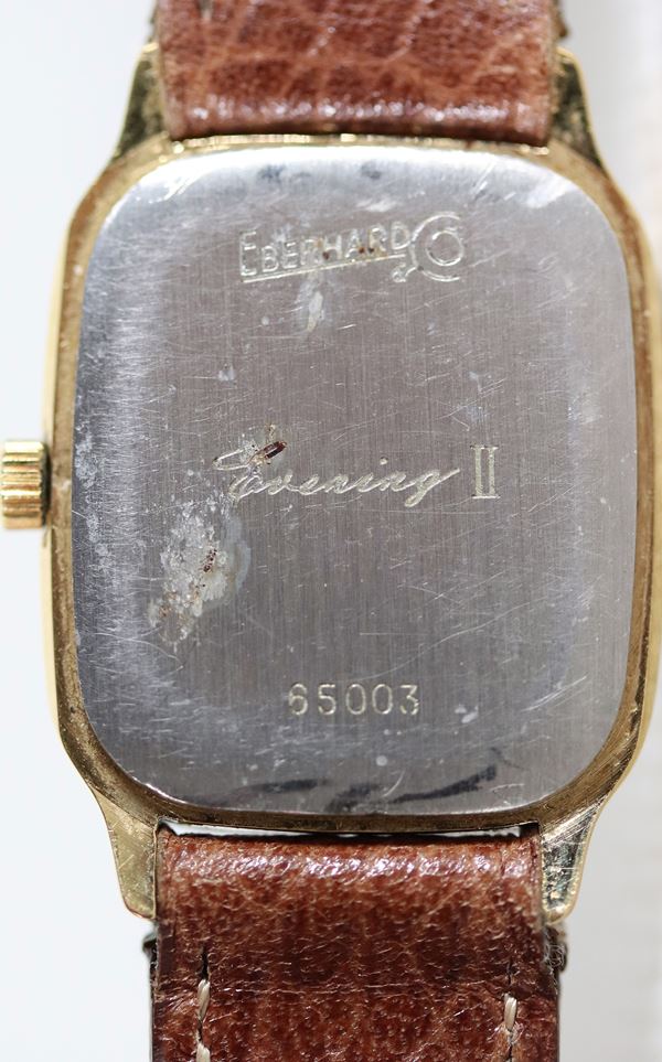 laminated gold case and steel caseback, dimensions mm. 190 x 200, quartz movement, leather strap. Ref. 65003. To be revised.