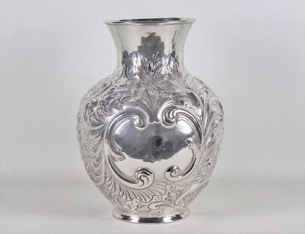 Large amphora vase in silver metal, entirely chiseled and embossed with motifs of scrolls of acanthus leaves and flowers