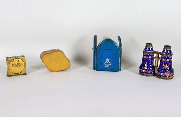Lot of a theater binoculars with enamels, a miniature with "Madonnina", an oval box in gilded metal with a miniature on the lid and an alarm [..]