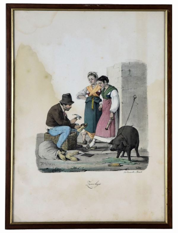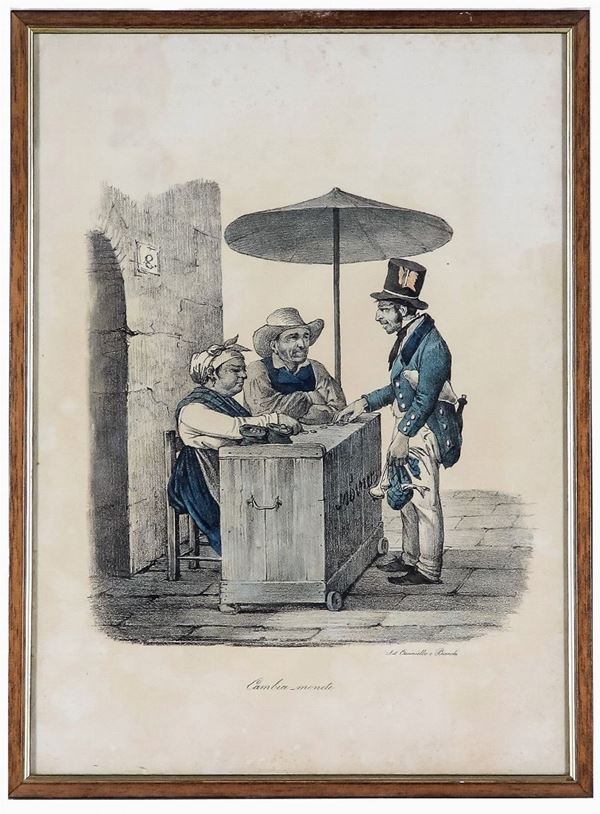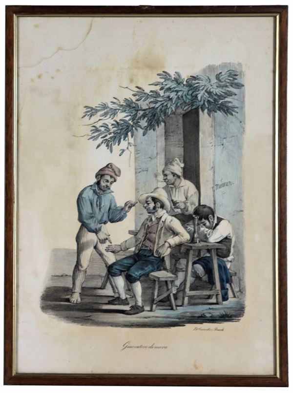 Lot of five ancient watercolor engravings "Neapolitan folk scenes"