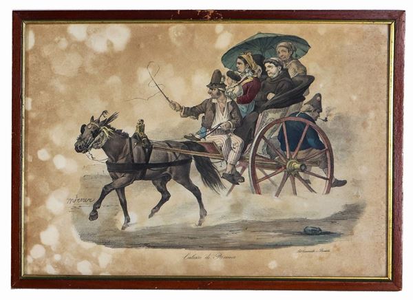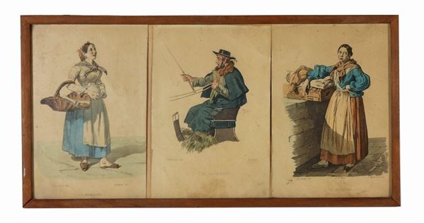 Lot of four ancient watercolor engravings "Neapolitan folk scenes"