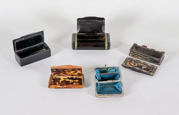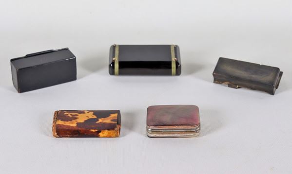 Lot of four snuff boxes and a coin purse, in wood, mother-of-pearl and fake tortoise shell (5 pcs)