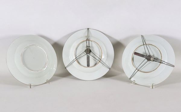 Lot of three Chinese plates in "Famiglia Verde" porcelain, with colorful decorations with motifs of flowers, animals and family scenes