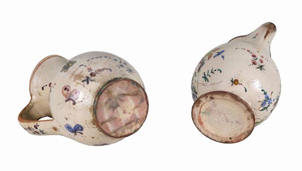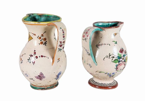 Lot of two Italian glazed majolica jugs with polychrome decorations of flowers and butterflies