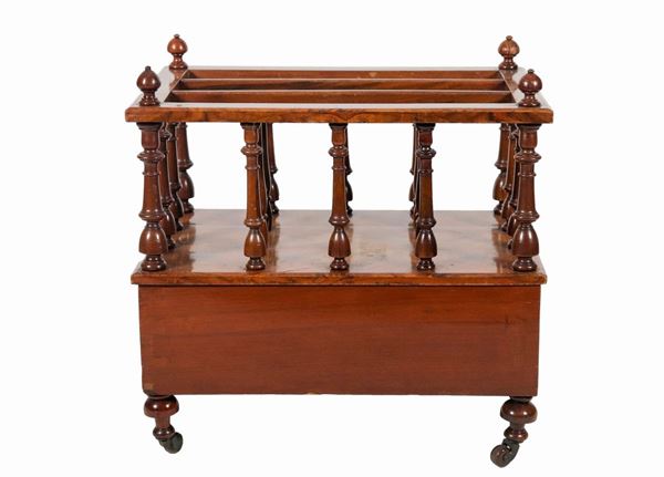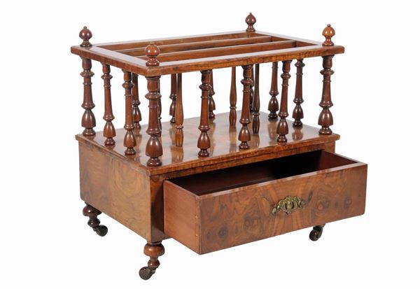 Magazine rack in walnut and walnut burl, with compartments with turned columns and a central drawer below