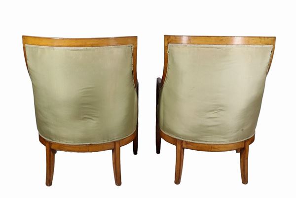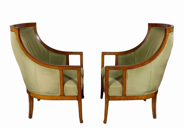 Pair of bergère armchairs in satin wood with inlaid threads, cover in green fabric