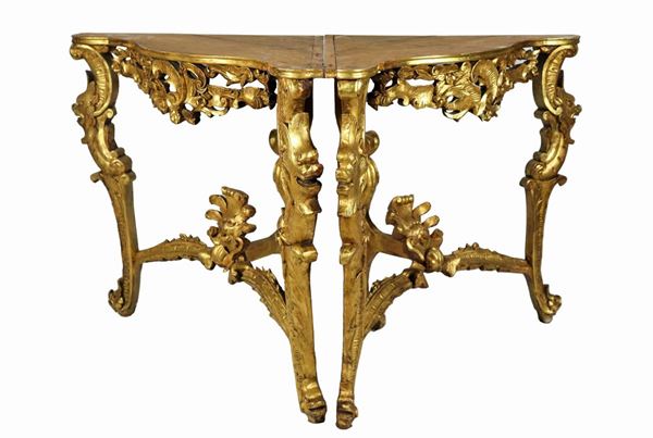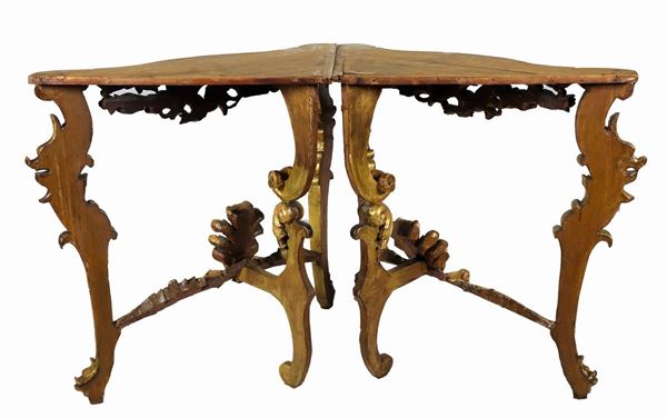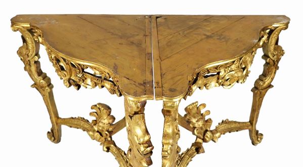 Pair of corner cabinets of the Louis XV line, in gilded wood and carved with motifs of curls, scrolls and masks' heads, three curved legs joined [..]