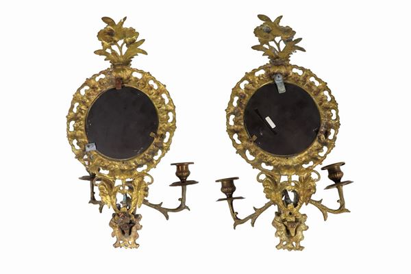Pair of French appliques in gilt bronze, embossed and chiseled with Empire motifs, with round mirrors and 3 flames each