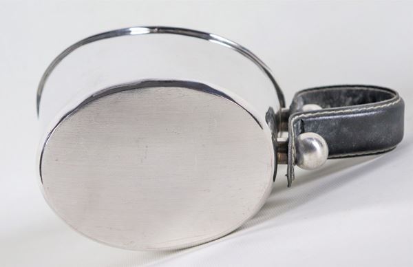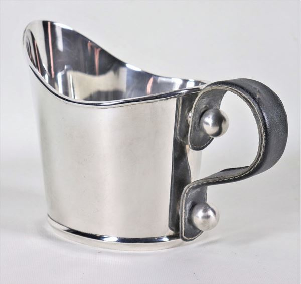 Pitcher in silver metal with handle covered in leather, interior in vermeil