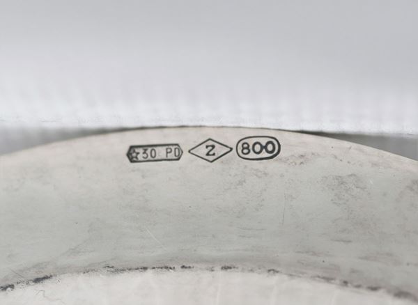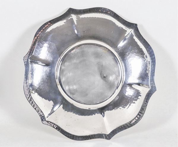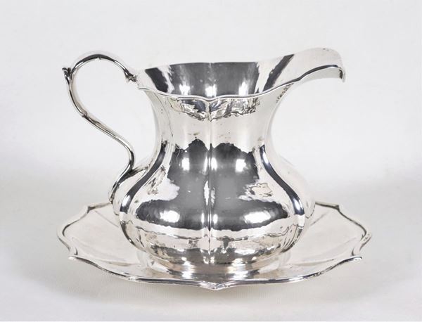 Pitcher with plate in embossed and hammered silver, gr. 990