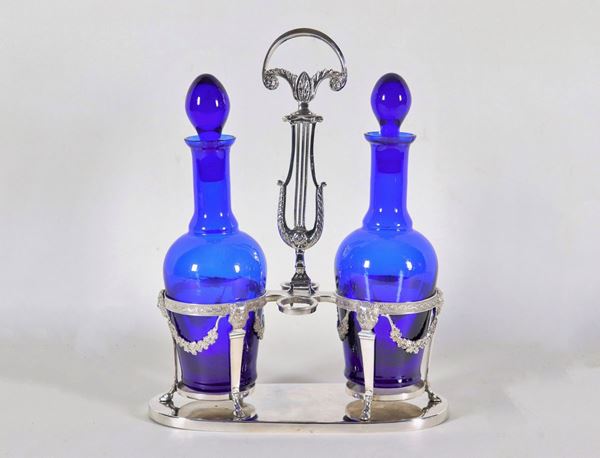 Primo Impero Roman oil cruet, in chiseled and embossed silver with neoclassical motifs of floral garlands and masks, lyre-shaped handle and [..]