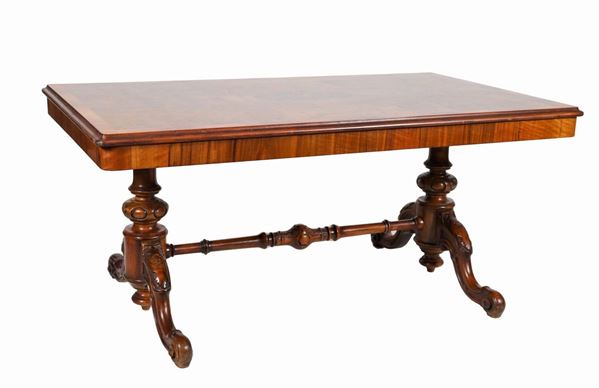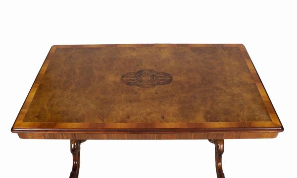 Rectangular living room table in walnut and briar of walnut, with inlaid band on the top and medallion in the center