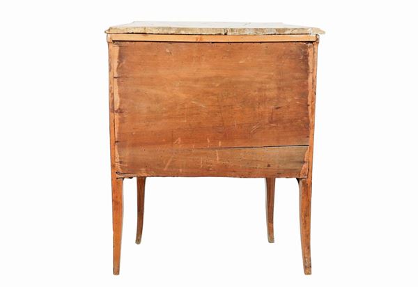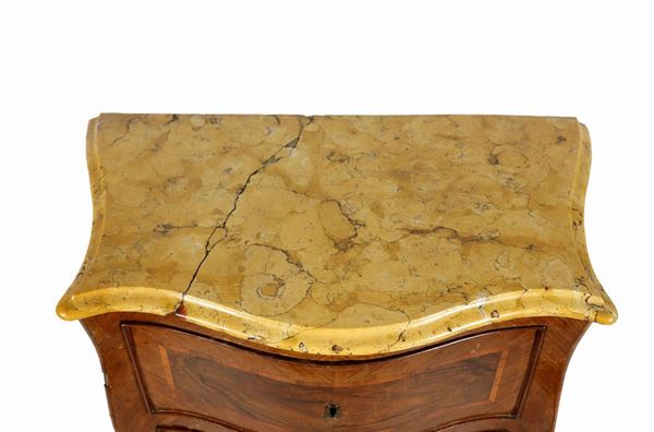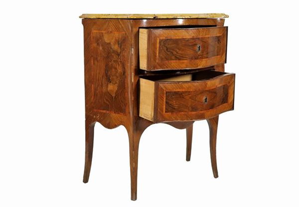 Roman bedside table of the Louis XV line in walnut, with inlaid threads in bois de rose, two drawers, four curved legs and top in yellow Siena [..]