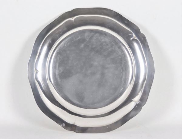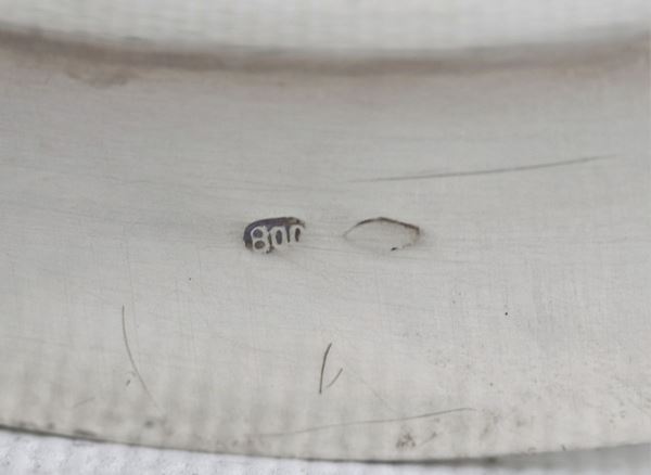 Round silver serving plate with ribbed and embossed edge, gr. 800