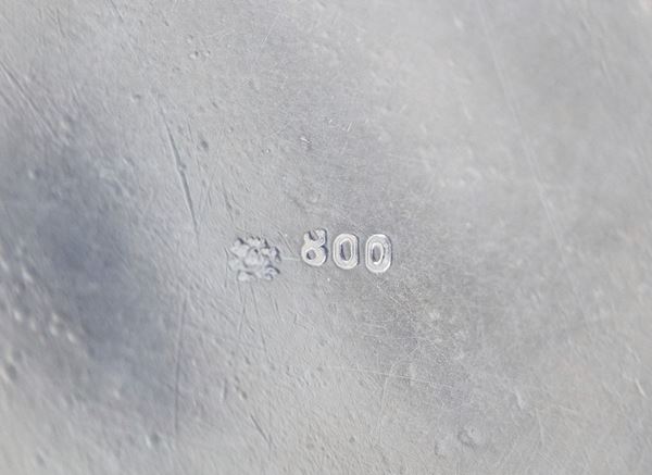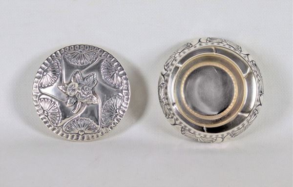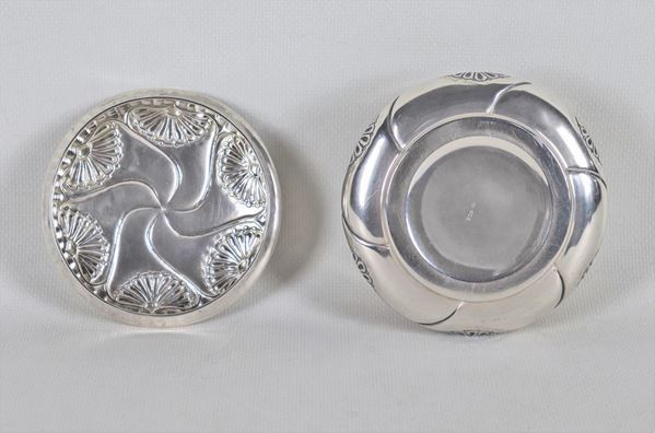 Round sugar bowl in chiseled and embossed silver with fan motifs, rose-shaped pommel, gr. 140