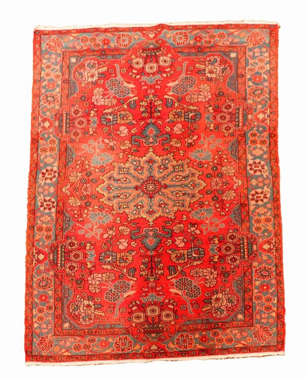 Saveh Persian carpet with geometric motifs on a red background M. 2.33 x 1.54