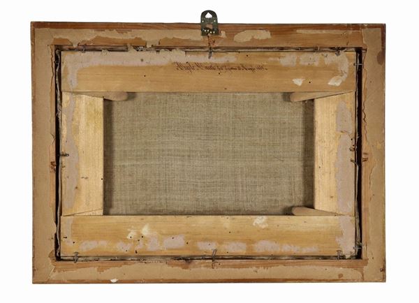 Signed and dated 1858 on the back of the frame. "View of the lake with fishing boats", small oil painting on canvas