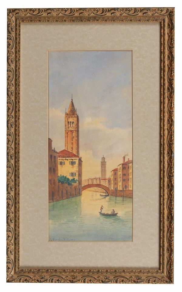 Signed. "Calle in Venice with gondola", watercolor on paper