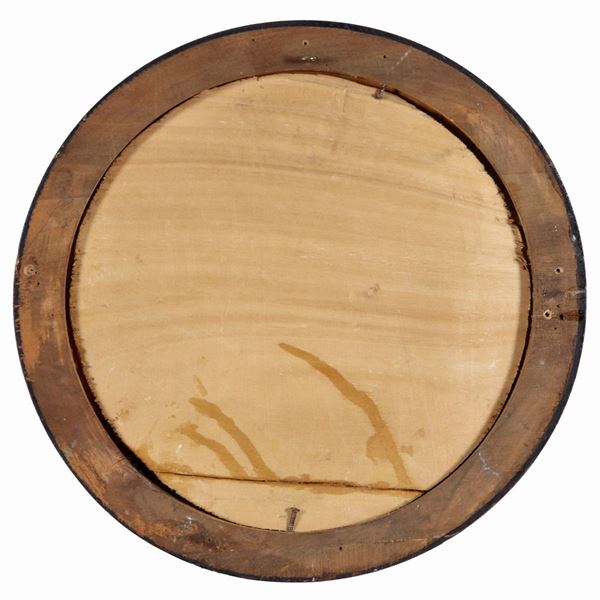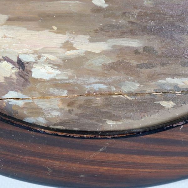 Signed. "Countryside landscape with goats", small oil painting on a round-shaped tablet