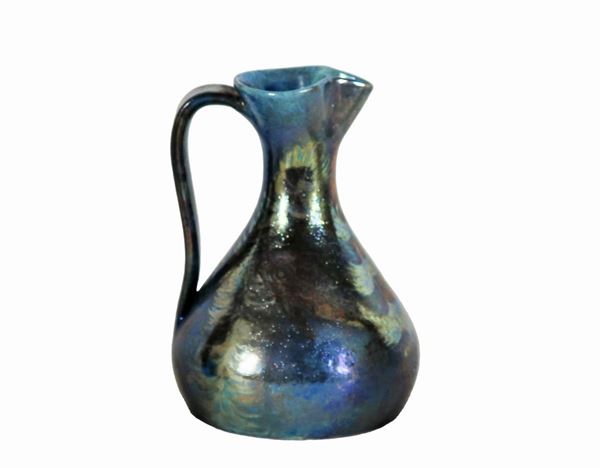Signed. Glazed ceramic jug with blue and gray background with silver highlights