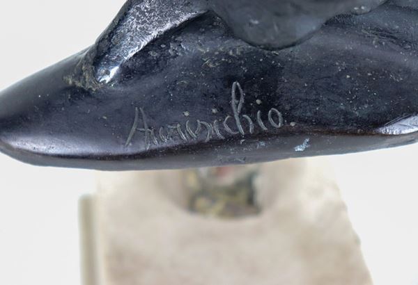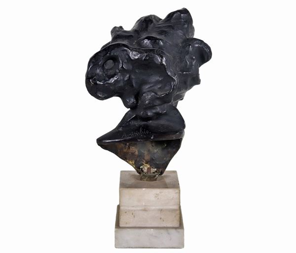 Signed. "La Dea bendata", bronze bust with white marble base