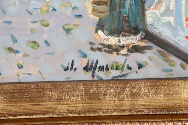 Signed. "Naples alley with characters", oil painting on plywood