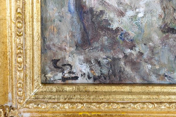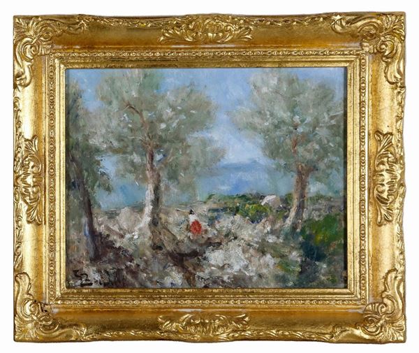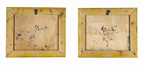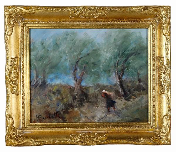 Signed. "Peasant women in the olive grove", pair of small oil paintings on plywood