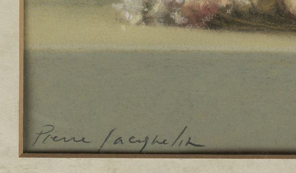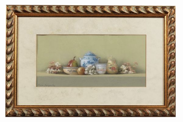 Signed. "Still life with tableware, fruit and flowers", watercolor on paper