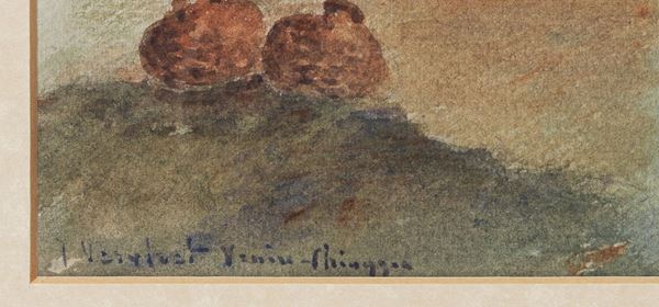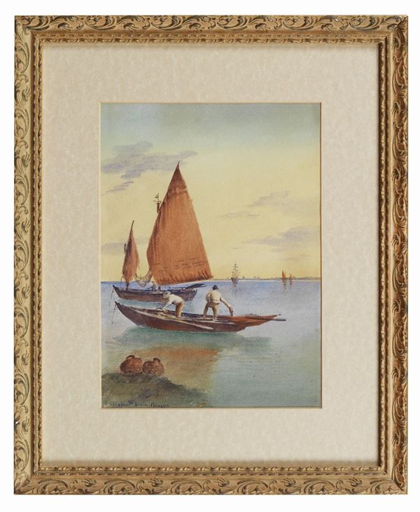 Signed. "Venice lagoon with fishing boats in Chioggia", watercolor on paper