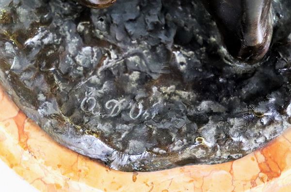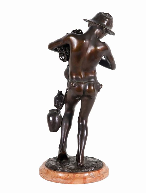 Signed. "Watermaker with jugs", bronze sculpture with circular base in brecciated marble