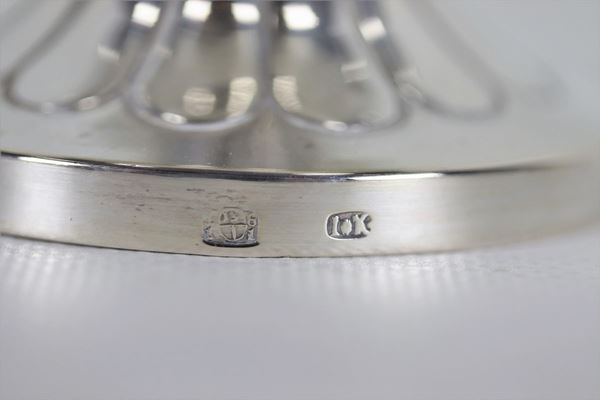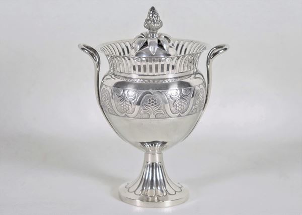 Silver sugar bowl in the shape of an amphora with handles, chiseled and embossed with a perforated railing edge, gr. 410